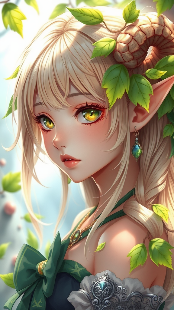 Enchanting blonde girl with delicate horns adorned with vibrant green leaves, rendered in intricate digital anime style, blending the ethereal touches of Loish and WLOP. Captivatingly detailed, this adorable digital painting captures the essence of an elven beauty, reflecting the artistic nuances of Guweiz. This hyper-detailed fantasy character is set against a whimsical backdrop, embodying an anime-styled 3D flair, perfect for captivating fan art on ArtStation.
