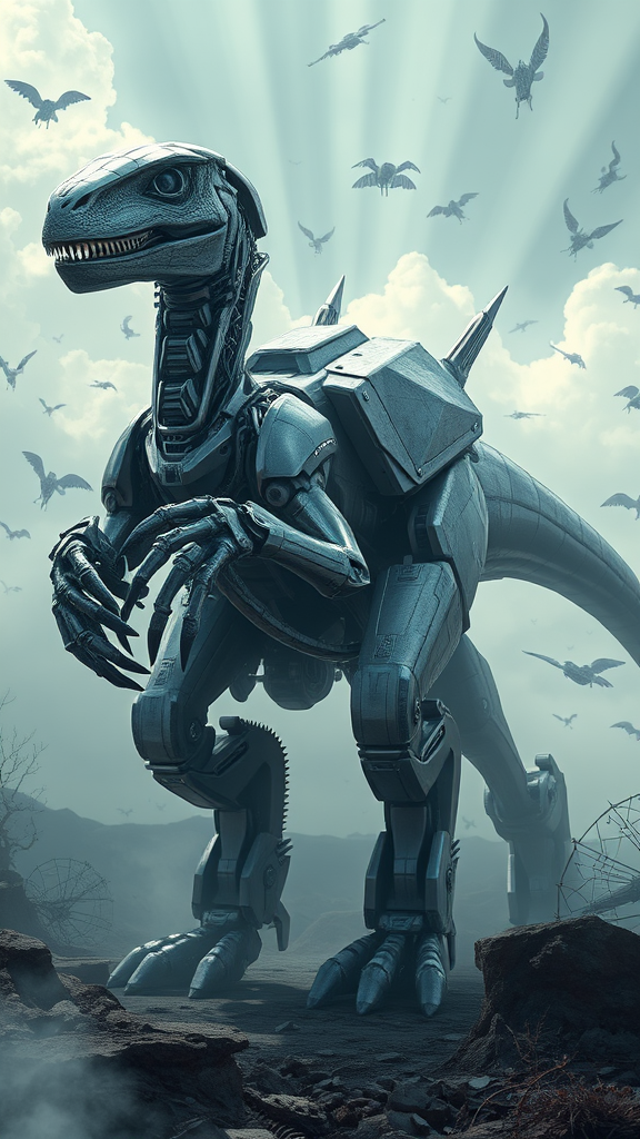 An otherworldly machine resembling a massive robotic raptor stands amidst a surreal landscape, its metallic form casting intricate shadows as UHD textures highlight its alien design. Godrays pierce through the mist, illuminating the raptor's gleaming surface. Schematic lines overlay its frame, hinting at a complex internal structure, while its anatomy is intriguingly distorted with jagged edges and segmented limbs. Its hands are a chaotic array of digits, with some missing and others in excess, creating a mesmerizing symmetry of imperfection. The machine's visage is warped, with an elongated neck and a sculpted face that appears both menacing and awe-inspiring. Flickering glitch effects reveal text errors, adding a digital aura. In the background, floating limbs and weapons defy gravity, surrounding the machine in a fragmented dance. Its proportions are hauntingly elegant, with elongated features and fused elements that suggest a fusion of biology and technology. A faint watermark and artist name can be discerned, hinting at human interference in its existence. The scene is captured with a mix of blurry and sharp qualities, enhancing the enigmatic essence of this biomechanical enigma.