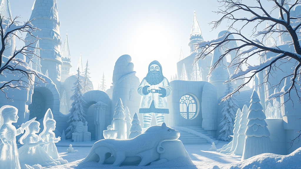 A breathtaking masterpiece in 8k hyper-realism depicting an enchanting world crafted entirely from ice. Every element is an exquisite ice sculpture forming a magnificent landscape of pure ice art. Towering ice buildings glisten with intricate detail, alongside frozen trees adorned with delicate ice leaves. Ice characters animate the scene, their forms radiating a soft luminescence. At the heart of this icy wonderland stands a grand, crystal-clear ice sculpture of Santa Claus, exuding a sense of magic and festivity. The sunlight cascades through the transparent ice, creating a dazzling display of sparkling reflections that dance across the pristine formations, adding warmth and life to the surreal, frozen panorama.