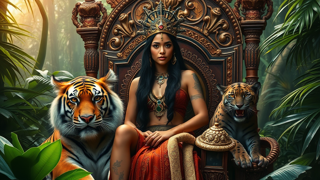 Gorgeous π goddess seated regally with a majestic tiger and sleek panther by her side, her detailed face radiating strength and beauty, perched on an ornate jungle throne surrounded by a verdant, lush environment bathed in cinematic light. The portrait captures the essence of junglecore with a rich, vibrant texture, inspired by the iconic photography style of Annie Leibovitz and expertly retouched to perfection, breathing life into an ethereal yet powerful character amidst an enchanting wilderness backdrop.