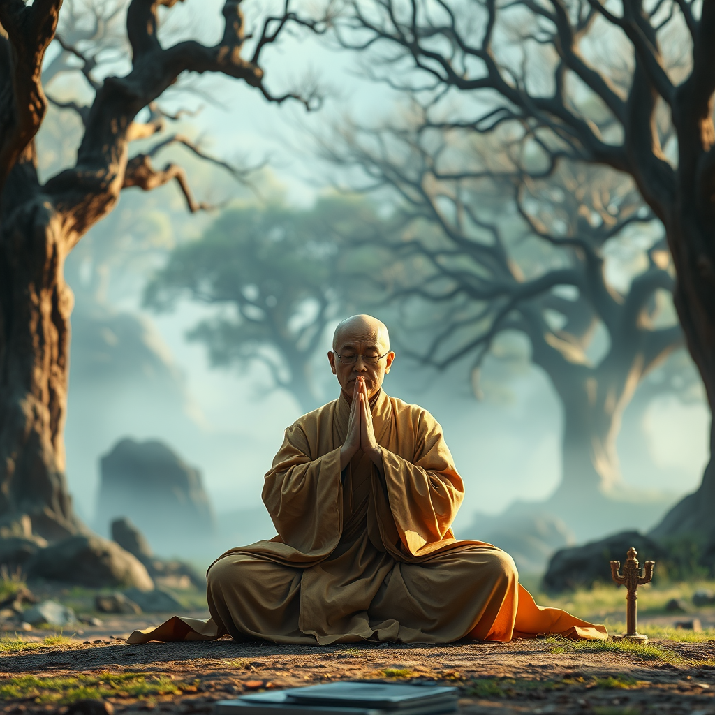 A serene monk in a flowing robe meditatively praying in a lotus pose amidst a mystical landscape, inspired by the style of Fang Congyi, with cinematic flair and intricate details, soft focus highlights the monk, ethereal light filtering through ancient trees.