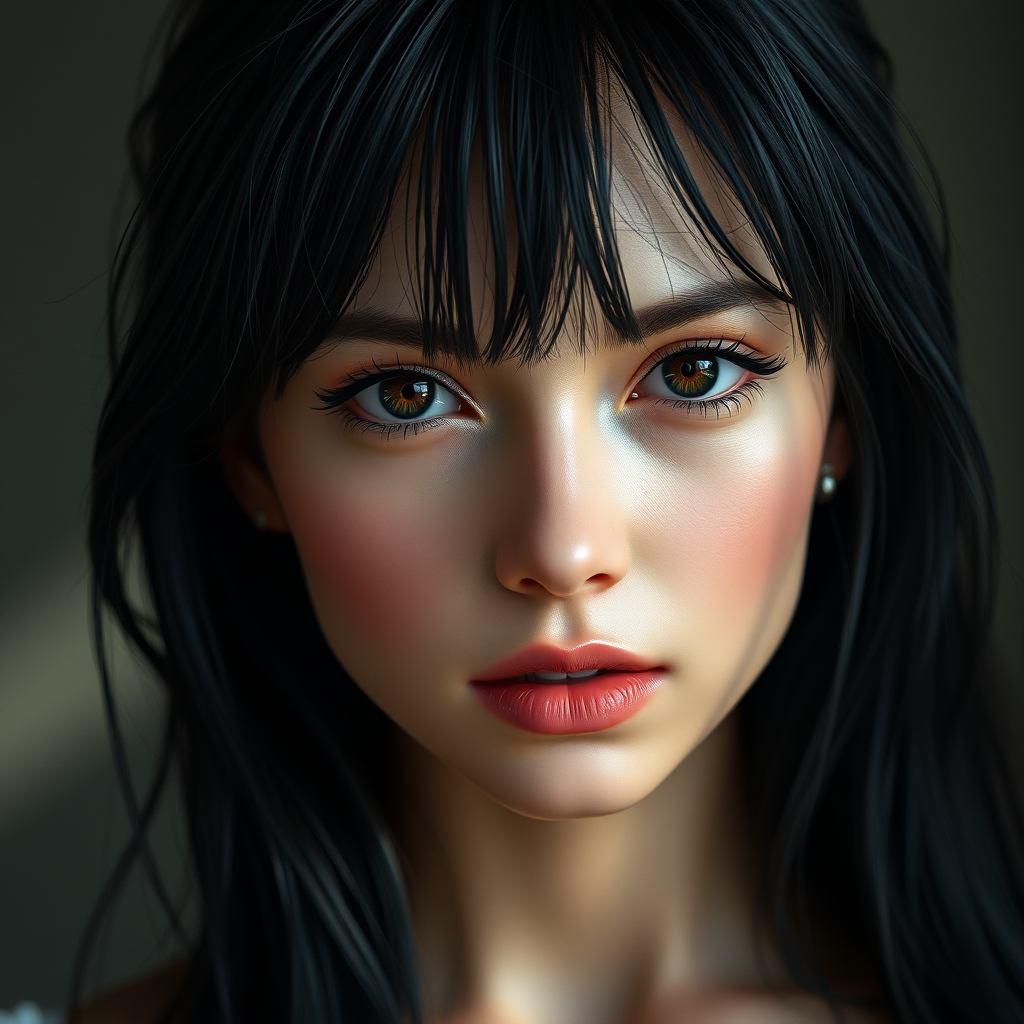 Stunning dark-haired woman gazing at the camera, portrait style, with exquisite skin detail, ultra-realistic and photo-quality resolution, showcasing full-length composition. Features elegant piercings, set in soft diffused light, utilizing a shallow depth of field for crisp focus, embodying hyperrealistic artistry with cinematic CGI lighting. Rendered with precision akin to a 3D doll using advanced techniques. Avoids common issues like distortion, low resolution, and artifacts, ensuring the portrayal remains captivating and proportionate throughout, free from any deformations or extraneous features.