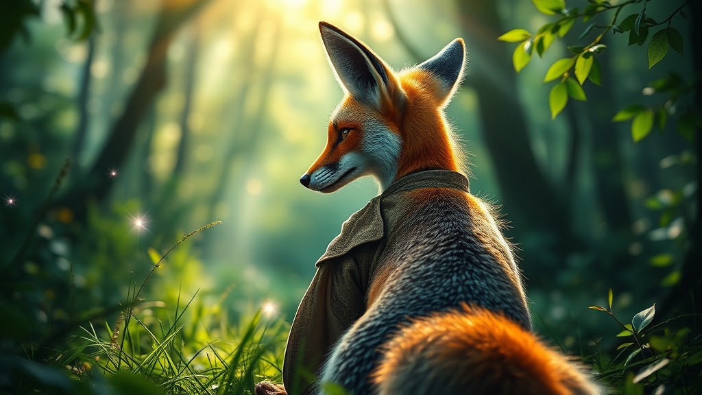 Award-winning RAW color photograph capturing an exquisite digital art portrayal of a stunning fox, with intricately detailed ears and a luxurious tail, adorned in elegant attire. The scene unfolds in a verdant, enchanting forest, imbued with fantasy elements reminiscent of d&d. High contrast and dramatic backlighting enhance the composition, featuring ethereal bloom and subtle chromatic aberration. The image boasts a smooth texture and razor-sharp focus, appearing as if captured by an advanced mirrorless camera. It achieves the pinnacle of visual excellence as a photorealistic 8k HDR masterpiece, with delicate light sparkles dancing throughout the lush landscape.