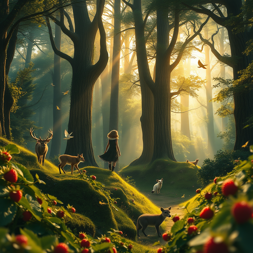 A young girl wanders through an enchanted forest where the sun casts a golden glow through the towering trees. Birds dance in the air, weaving between branches, while curious fawns peek from behind bushes. A sly fox slips through the shadows, closely watched by playful raccoons. Strawberries dot the forest floor, providing bursts of red against lush green. The scene echoes the whimsical style of Hayao Miyazaki with its 8k, HD quality, and masterful use of contour light. A high contrast brings depth to each detail, with a focus on ultra-realistic textures and depth of field that adds to the photorealism. The scene's enormity, capturing gigantism, draws you in from a first-person perspective—details abound, with a subtle dark tone that enriches the epic tableau. The bokeh effect adds softness to the background, contributing to the cinematographic atmosphere in this super detailed, lifelike world.