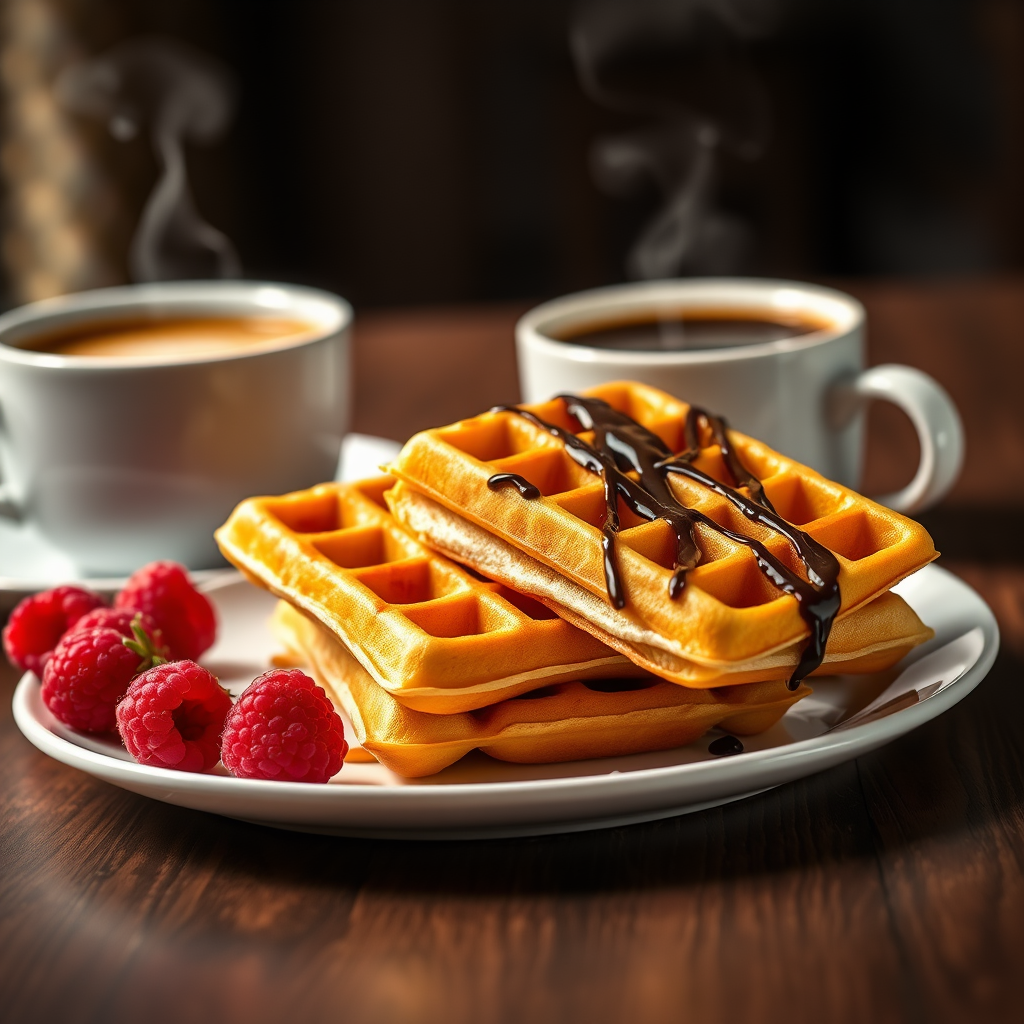 Golden Viennese waffles drizzled with rich dark chocolate sit elegantly on a plate, accompanied by a steaming cup of creamy cappuccino. Beside the waffles, a duo of ripe raspberries adds a pop of vibrant color. The scene is enhanced by professional color grading, featuring gentle shadows and minimal contrast, captured in a clean, sharp focus. The setting exudes the essence of gourmet food photography with bokeh effect, offering hyper-realistic details under dramatic, moody lighting, in a 9:16 aspect ratio.