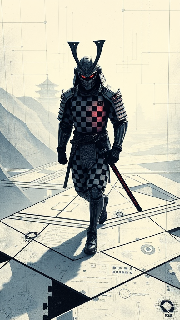 Inspired by the concept of a schizophrenic nuclear samurai and tesselated AI omen, create an evocative scene where an enigmatic samurai warrior, clad in futuristic armor that shimmers with an op art checkerboard pattern, navigates an abstract landscape. The environment is a complex maze of intersecting lines and geometric shapes, hinting at a digital realm influenced by artificial intelligence. The air is heavy with an eerie sense of prophecy, as if the very atmosphere is alive with coded predictions of a nuclear future. The scene captures the tension between ancient warrior spirit and modern technological foreboding.
