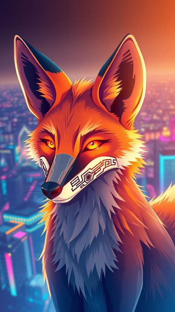 A vivid illustration of a digital fox, its sleek, pixelated fur shimmering in shades of neon orange and blue. The fox's bright, intelligent eyes peek out from above a sleek, futuristic mask that covers its snout, patterned with intricate circuit-like designs. Its ears are perked up, as if attuned to the digital world's electric hum, while a faint glow illuminates the tips of its bushy tail. In the background, a panorama of a virtual cityscape stretches out, composed of vibrant, shifting pixels. The fox embodies the blend between the natural and the technological, exuding both mystery and modernity.