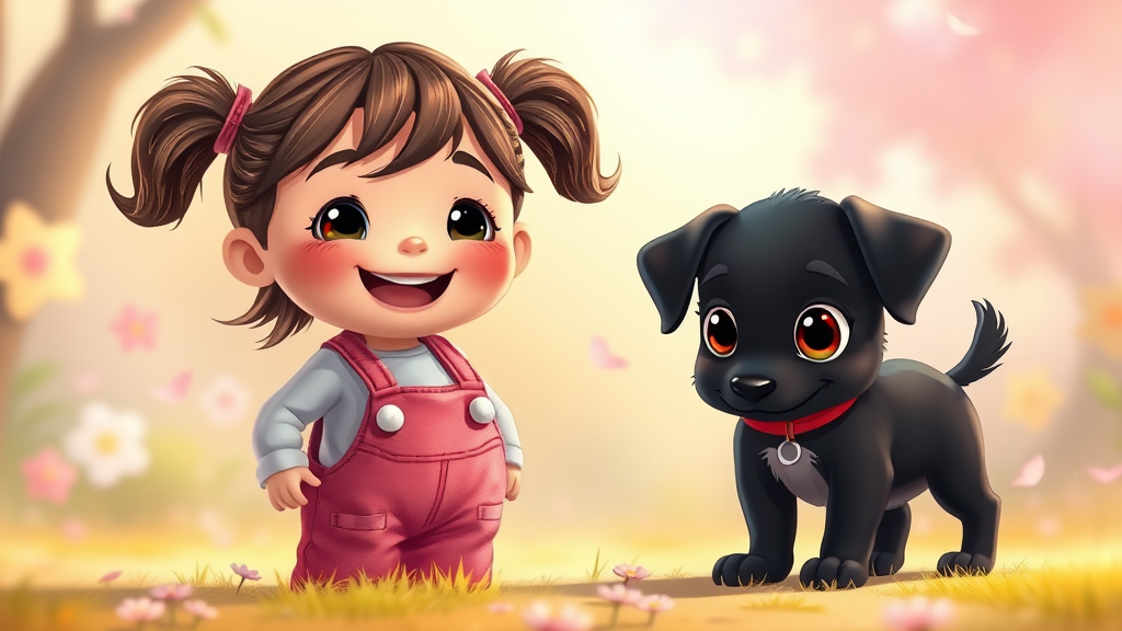 A whimsical scene features a joyful little girl with bright pink overalls, her hair in playful pigtails, standing beside an adorable black puppy with oversized, curious eyes. The duo is set in a dreamy, cartoonish world where everything feels vibrant and alive. The girl's expression is one of pure delight, and the puppy mirrors her excitement with its tiny wagging tail. The background is a soft blend of pastel colors, reminiscent of Alain Laboile's playful photography, while the characters have the distinct stylized look of Eve Ventrue and Patrick Brown, with exaggerated features and a sense of adventure in their poses. The overall atmosphere is one of innocence, joy, and the boundless energy of childhood imagination.