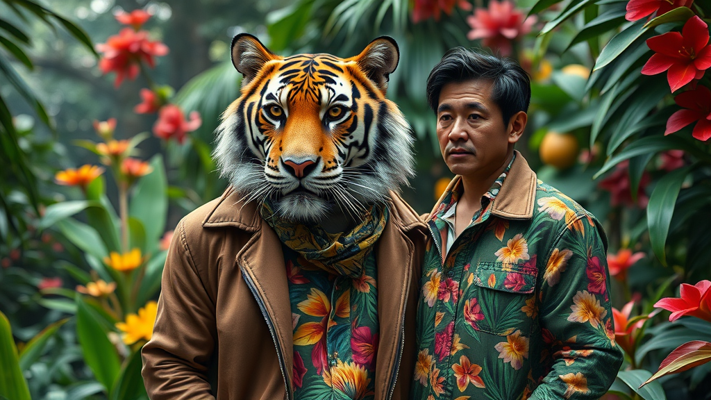 A majestic tiger dons a vibrant ensemble, combining a sleek jacket, a warm scarf, and a bold Hawaiian floral shirt, all set within a lush jungle teeming with diverse flora. Nearby stands a man, clad in a jacket reminiscent of Christian W. Staudinger's style, the scene echoing the extravagance of an album cover. The atmosphere is infused with maximalist elements and a fking_scifi vibe, reminiscent of the fantasy worlds of L. Frank Baum. A colorful fruit backdrop adds to the vibrant panorama, captured in RAW candid cinema style with a 16mm cinematic camera. The visual is color graded to emulate Portra 400 film, highlighting remarkable hues. The tiger’s ultra-realistic skin texture, with detailed and striking pupils, blends harmoniously with the environment. Subtle skin fuzz and the authentic portrayal of dry skin contribute to a hyper-realistic depiction. The photograph's canvas frame presents a contrast of animated charm against its detailed realism, avoiding digital distortions and maintaining natural proportions within a photogenic composition.