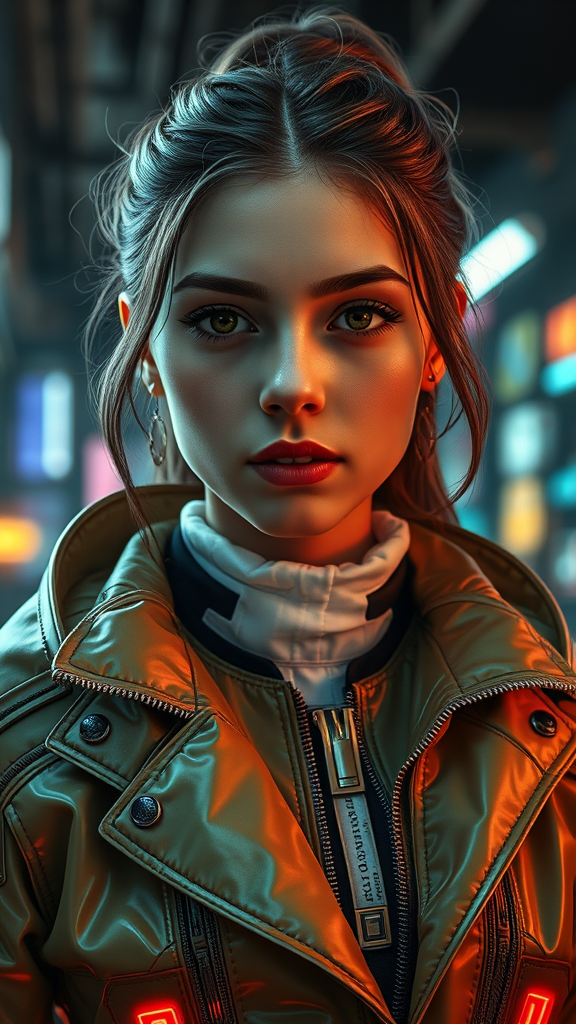 A detailed portrait of a European young girl in a futuristic sci-fi movie jacket coat, blending royal attire with cyberpunk and neotokyo aesthetics. The scene is inspired by the works of Ismail Inceoglu, Dragan Bibin, Hans Thoma, Greg Rutkowski, Alexandros Pyromallis, and Rene Magritte. Her face is perfect with sharp features, realistic shading, and fine details, embodying a pretty and fine face that captures attention. The image is set in a synth-wave, Bladerunner-inspired scene with dramatic lighting that highlights the intricate design of her clothing. The jacket boasts low-emission neon details, enhancing the overall futuristic theme. Captured as a high-detail RAW color photo, the portrait uses a professional f1.6 lens to emphasize rich colors and hyper-realistic textures. The overall mood is one of realism and hyperrealism, echoing the style of highly detailed CG unified 8K wallpapers through physics-based rendering. The focus is on capturing a lifelike, cinematic essence, combining elements of CGI, digital art, and a blend of artistic influences for a unique portrayal.