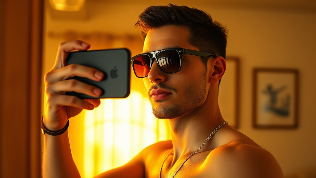 Capture a hyper-realistic image of a strikingly handsome man in stylish beachwear, sporting sleek sunglasses, posing confidently in front of a mirror with an iPhone 14. His short, dark hair is impeccably styled, adding to his allure. The setting is a cozy room bathed in warm, golden hour light that fills the space with a welcoming glow. The ambiance is enhanced with a subtle film grain texture reminiscent of Kodak Portra 800, while the photo is shot with a wide aperture at f1.8 to create a softly blurred background, emphasizing the subject against the bright, inviting environment.