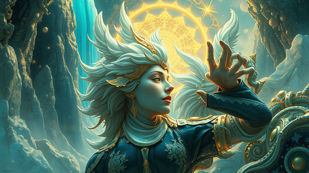 Visual fiction, crafted by the visionary visual artist Christiano V, inspired by the unique style of Franciszek Starowieyski, featuring exquisite blends of gold and cyan. These hyper-realistic sci-fi illustrations embody romantic scenes with organic sculpting influences and a touch of Android Jones' creativity, exploring a world of romantic fantasy. The artwork's dimension echoes a lush, surreal landscape where ethereal beings and celestial elements intertwine seamlessly.