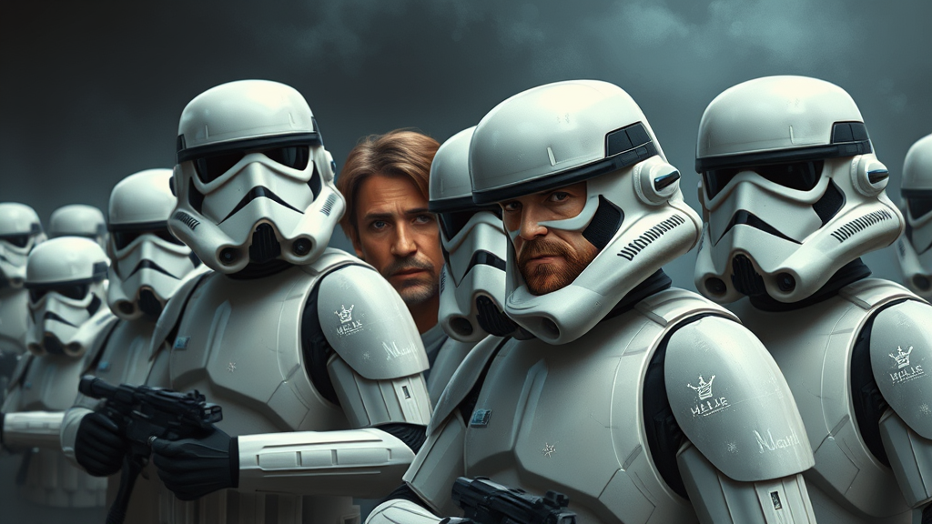 A whimsical and imaginative digital art piece depicting Hollywood celebrities reimagined as stormtroopers in the Star Wars universe, with the iconic armor subtly adapted to reveal the distinct facial features and expressions of renowned actors and actresses. Set against a moody and atmospheric backdrop, the composition captures a playful and satirical tone, blending humor with elements of geek culture. The scene includes subtle visual cues referencing their famous roles, adding layers of intrigue to their stormtrooper personas, creating a blend of cinematic parody and sci-fi homage.