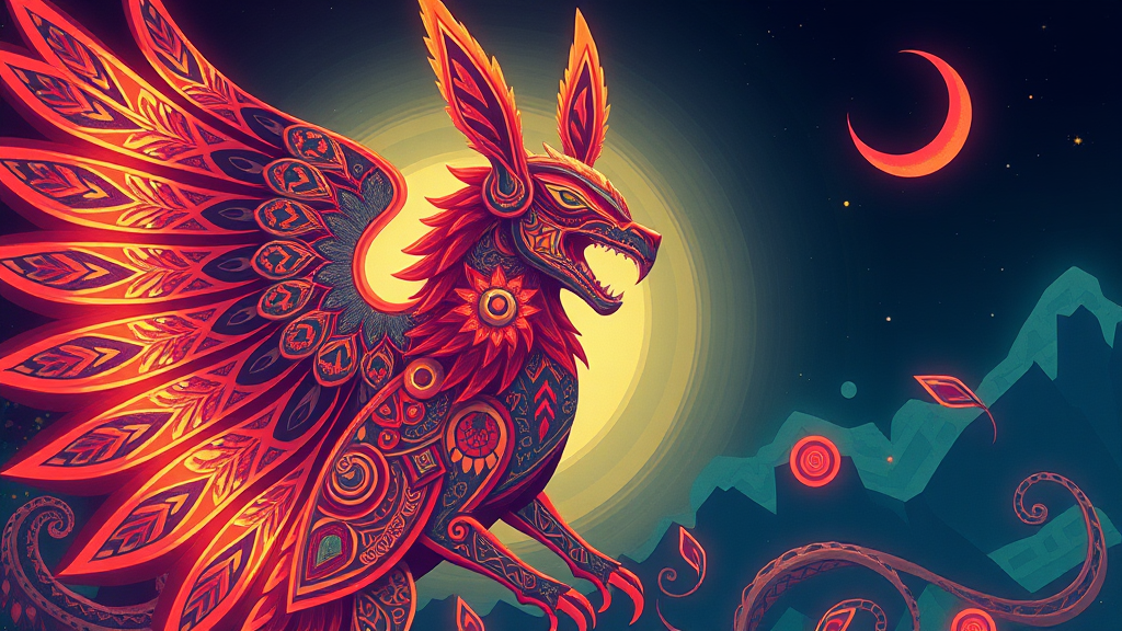 Totem animal fantasy illustration in Aztek tribal style, featuring ornate and intricate designs inspired by heartstone and Ankama aesthetics. The artwork blends the GTA5 cover style with the vibrant colors and glowing aura typical of Makoto Shinkai and RHADS. The piece showcases an elegant and intricately detailed creature, embodying the elegant, sharp focus seen in works by Lois van Baarle and Ilya Kuvshinov. The composition radiates energy with pastel and vibrant colors, reflecting inspirations from masters like WLOP, Artgerm, Greg Rutkowski, and Alphonse Mucha. The illustration is a digital painting and concept art masterpiece with a matte finish, embodying the artistic spirit of Jesper Ejsing and RossDraws, in a surreal 2:3 aspect ratio and heightened detail.