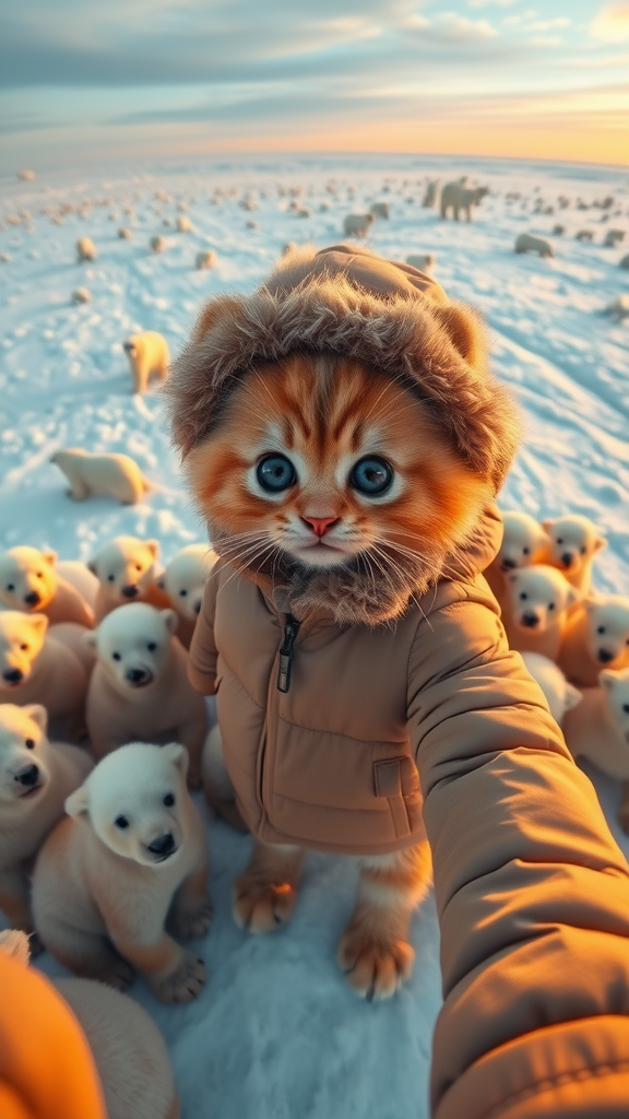 In a vast snowy landscape, an ice field stretches with numerous polar bears scattered across it. A charming kitten, donning a soft brown down jacket and a cozy matching hat, stands in the foreground, capturing a selfie. The kitten possesses large, gleaming eyes and lush, long fur, encircled by over a dozen playful polar bear cubs. The scene is bathed in the golden hues of sunset, accentuating the hyper-detailed textures and warm atmosphere of this enchanting, serene moment.