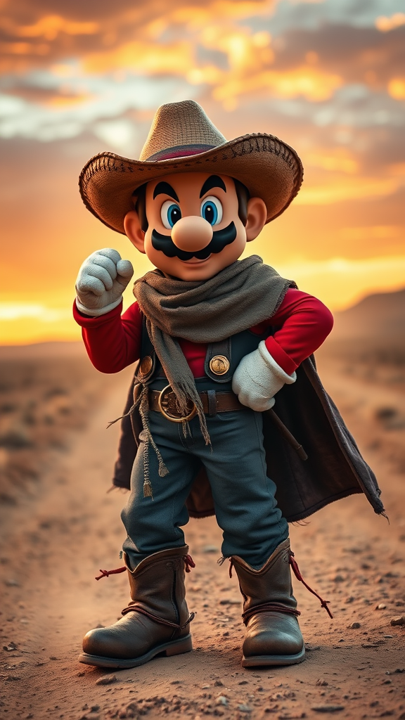 Super Mario transformed into a rugged cowboy straight out of a wild west adventure, sporting a weathered sombrero-style cowboy hat, a frayed poncho draped over his iconic red shirt, and a pair of worn leather boots that have seen many dusty trails. He wears a dark duster coat that flutters in the wind, enhancing his adventurous aura. The scene captures the essence of a dynamic motion picture moment, with Mario striking a confident pose against a backdrop of vast open plains, dusty trails, and a dramatic sunset sky painting a classic wild west scene.