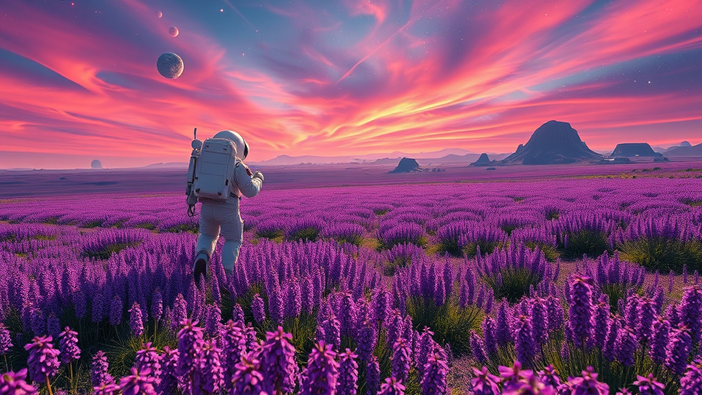 Astronaut exploring a surreal purple meadow under a stunning alien sky, breathtaking sci-fi landscape, intricately detailed, high-definition 4k clarity, hyperrealistic touch, vibrant colors, ethereal atmosphere with celestial bodies in the distant horizon, a visionary blend of reality and imagination.