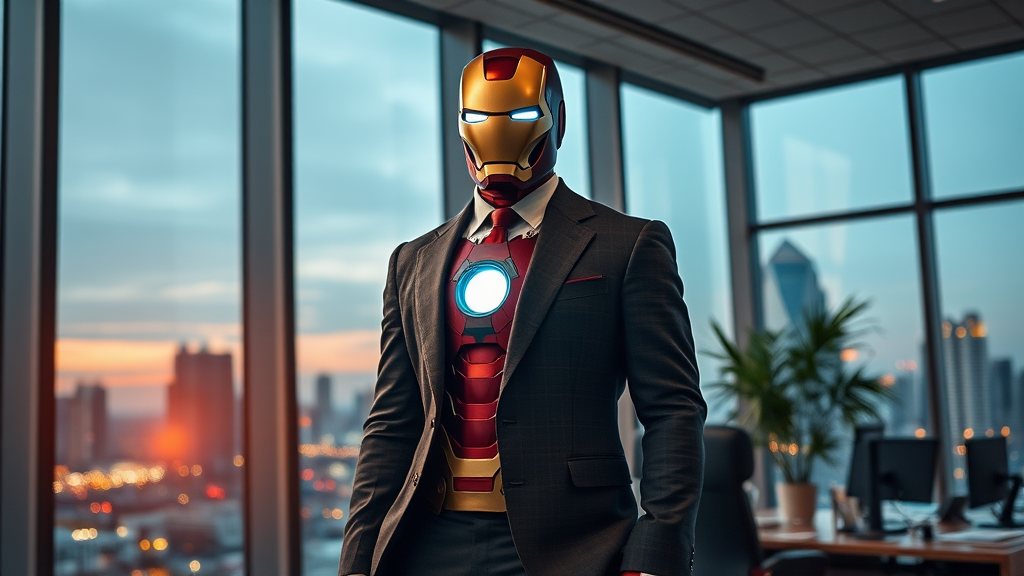 Ironman embodies a savvy businessman persona, standing in a sleek, modern office with floor-to-ceiling windows casting dramatic shadows under the evening light; his tailored suit exudes sophistication while his arc reactor subtly glows beneath the fabric, hinting at his dual identity; the room is furnished with high-tech gadgets, depicting a perfect blend of corporate success and superhero prowess as he overlooks the bustling cityscape, portraying a dynamic balance of power, intellect, and responsibility.