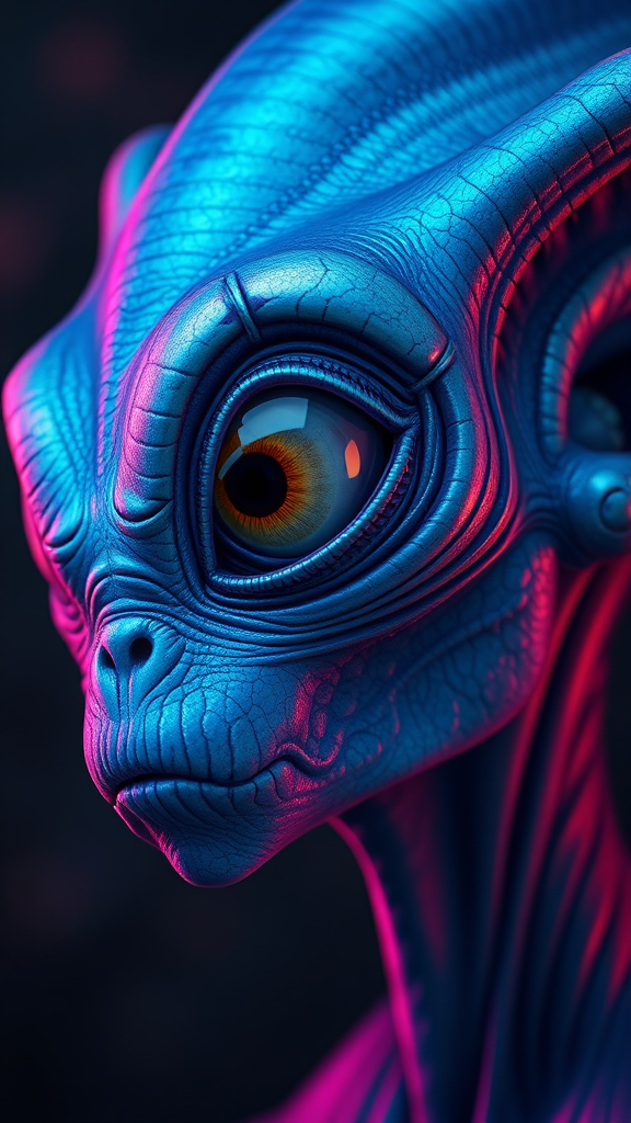 Alien portrait showcasing a blue extraterrestrial with a singular enormous eye and large, expressive ears, immersed in an array of vibrant and striking colors. The focus is on a highly detailed, symmetrical design, capturing the intricate nuances of the face and textured skin with finesse. The setting boasts cinematic lighting, evoking an epic sci-fi fantasy atmosphere. The digital art is hyper-realistic, rendered in ultrarealistic 8K quality, possessing an HDR masterpiece status with sharp focus. Embracing a side view, the character exudes an enigmatic and captivating presence. This composition leans towards vibrant and detailed artistry, avoiding blurry or simplistic depictions, resulting in a breathtaking digital painting.