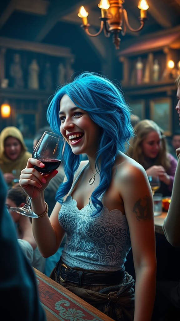 A highly detailed and realistic full-body image from a fantasy movie featuring a young girl with bright blue hair, laughing joyfully as she sips on wine in a lively medieval tavern. She is wearing an intricately designed white strapless tube top that complements her vibrant hair. Around her, peasants engage in animated conversations, their earthy attire contrasting with the deep, rich wooden textures of the tavern. The scene is bathed in ethereal blue volumetric lighting, casting a mystical glow across the room. It captures ultra-detailed, ultra-realistic cinematic qualities with a hint of whimsical chaos, evoking the lively atmosphere of a magical, bygone era.