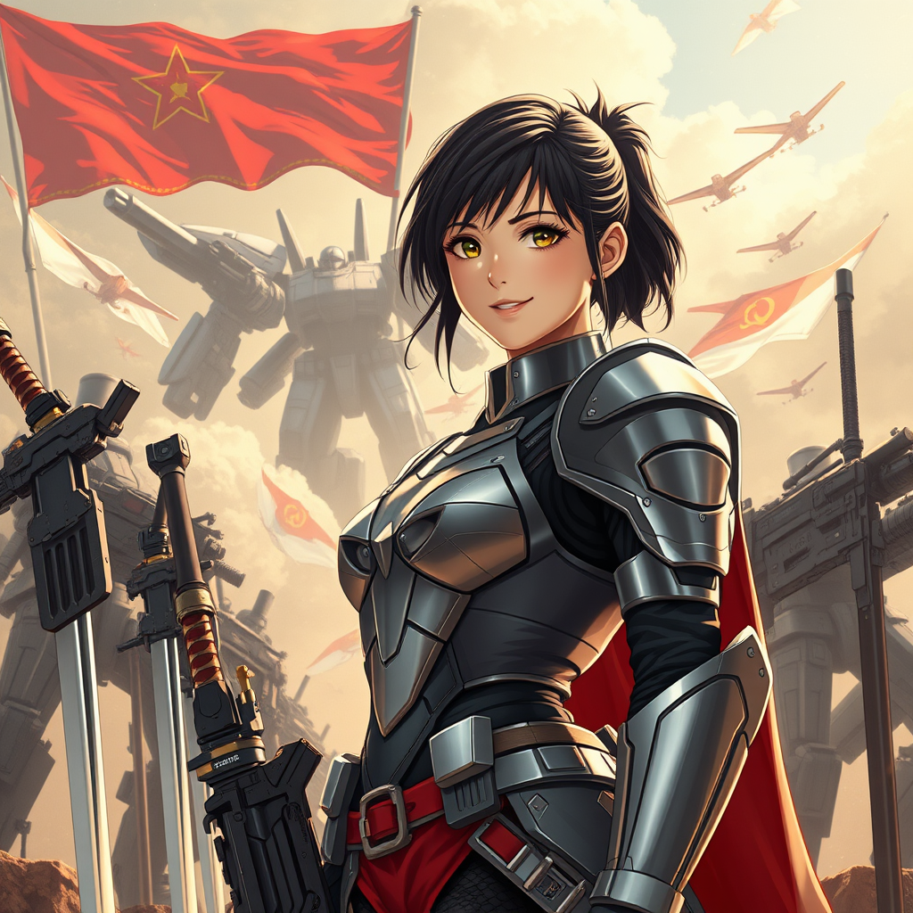 A stunning young heroine clad in sleek, futuristic warrior armor stands proud against a backdrop reminiscent of vintage Soviet posters, complete with dynamic mech warfare scenes in the distance. Surrounding her are an array of swords and state-of-the-art firearms. The atmosphere is alive with the contrast of sunny weather illuminating her in natural light, enhancing the anime and manga-inspired graphics. The colors are rich and dark, embodying high-detail artistry akin to offset printing quality. Despite the intensity of her surroundings, her expression remains happy and determined, beautifully rendered in 8K resolution, capturing an exquisite balance of tradition and innovation in a tall, poster-like format.