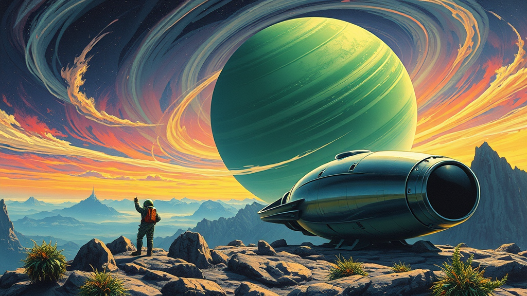 An illustration inspired by 1970s sci-fi book covers, depicting an alien spacecraft perched on the rocky surface of a distant exoplanet. Two astronauts stand nearby, one pointing towards the horizon. Above them, a vast green gas giant dominates the sky, its swirling patterns partially obscured by wisps of atmospheric clouds. The scene is bathed in an otherworldly glow, with hints of vibrant colors reflecting off the spacecraft's metallic surface. Mysterious alien flora adds a touch of the unknown to the foreground, as distant mountain ranges stretch out under the looming, colorful expanse of the alien sky.