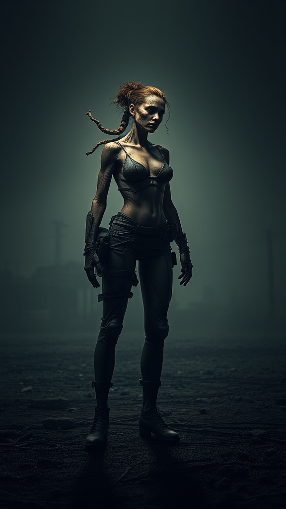 A lone female soldier stands in a desolate post-apocalyptic landscape, her figure illuminated by dramatic, moody lighting reminiscent of an intense cinematic scene. Shadows stretch ominously around her, enhancing the dystopian atmosphere. Her appearance is a haunting blend of disfigured and mutated features, with unsettling anatomical anomalies like extra limbs and floating appendages. Her form is an unsettling mix of human and grotesquely distorted elements, as if shaped by the harsh, unforgiving world around her. The scene is filled with cinematic noise, capturing the essence of a world gone awry, with strong movie-like photography drawing the viewer into the disturbing, mutated reality.