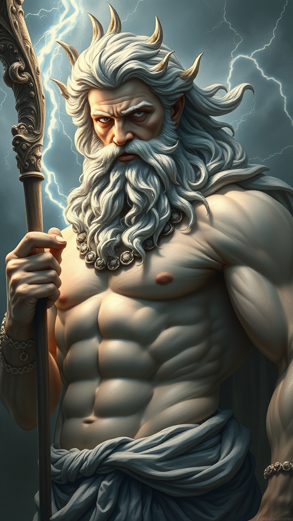 Portrait of Zeus, god of thunder, holding a lightning staff in one hand, showcasing his powerful and muscular physique. Rendered in a fantasy, highly detailed digital painting style, reminiscent of works by Gaston Bussiere and Alphonse Mucha, featuring intricate and elegant elements with smooth and sharp focus. The image is designed to captivate with its artstation-concept art feel; however, some intentional imperfections such as text errors, cropping issues, low resolution, and a touch of jpeg artifacts add a unique character. There is an artistic play on anatomy with occasional extra fingers or elongated neck, fused and mutated hands, conveying a surreal and abstract impression. Despite these quirks, the portrayal maintains its majestic aura, capturing the essence of the thunder god in a thought-provoking and avant-garde manner.
