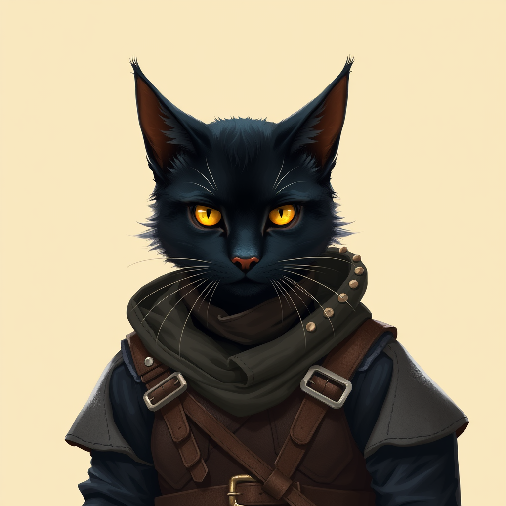 A lone cat girl stands in a cowboy shot frame, embodying the essence of a tabaxi with distinct khajiit features. She possesses sleek black fur that contrasts with her striking yellow eyes, which hold a mischievous glint. Her animal nose and ears are highlighted, giving her a distinctly feline appearance. Dressed in rugged leather armor, she exudes the aura of a rogue or thief, skilled and cunning. The scene is set against a simple background, emphasizing the character's bold presence. The color palette centers around warm yellows and whites, further accentuating her mysterious yet playful nature.
