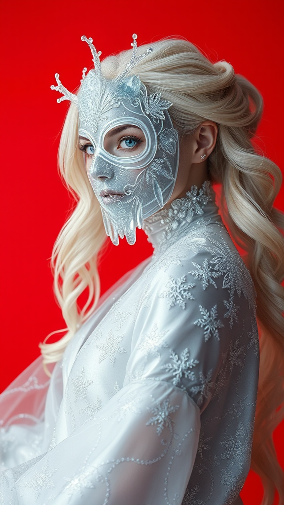 A hyper-realistic portrait, in HD, 8K, of a woman wearing a full mask crafted from glistening ice and frost. The mask is smooth and semi-translucent, adorned with intricate crystal formations branching irregularly along the edges, echoing the fractal patterns of frozen water. She is dressed in a flowing gown of dazzling silver and white silk, finely embroidered with intricate snowflake designs, the fabric shimmering as though touched by frost. The gown moves as if caught in an everlasting, gentle winter breeze, creating an ethereal sense of fluidity. Her hair, a cascade of silky white waves, sparkles softly, enhancing her pale, porcelain-like skin that radiates a gentle, frost-kissed luminescence. The background is a vivid orange red, a surreal contrast to the icy elements of her attire, creating a striking visual harmony that highlights her frozen elegance. Soft, cool lighting enhances the translucent details of her mask and the icy sparkle of her gown, wrapping her in an aura of otherworldly magic and pristine winter beauty.
