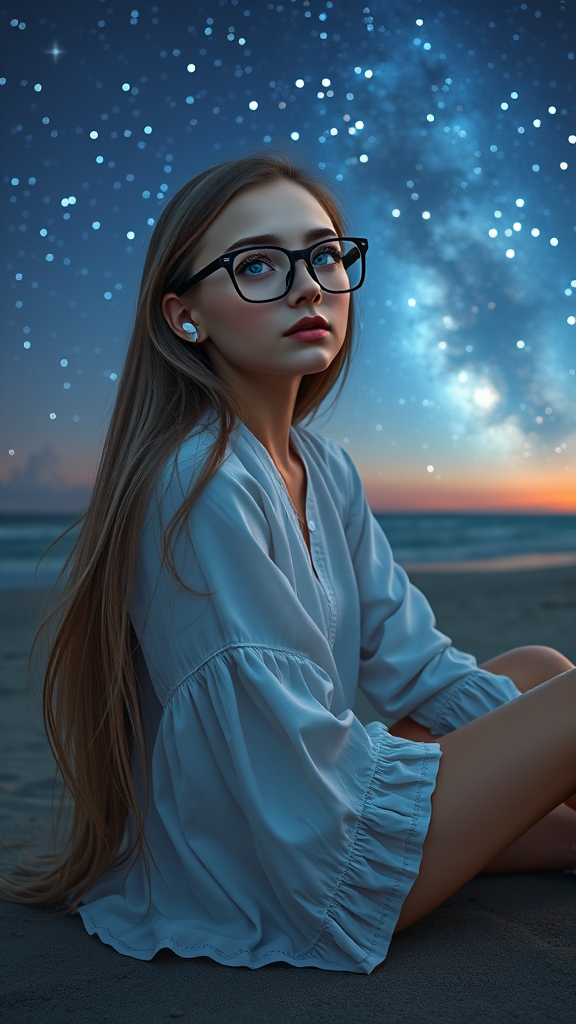 A graceful girl with long flowing hair and captivating blue eyes sits serenely on the beach, gazing thoughtfully into the distance. She wears stylish glasses and AirPods, embodying a blend of elegance and tranquility. Her features are symmetrically perfect, exuding a gentle and quiet charm. The scene captures her full body against a breathtaking starry night backdrop. The intricate design and hyper detail bring the image to life, with glowing colors and natural lighting enhancing the landscape's beauty. The wide-angle capture reveals a mesmerizing vision, showcasing the highest quality of detail with depth and clarity, reminiscent of an RTX ray tracing masterpiece.