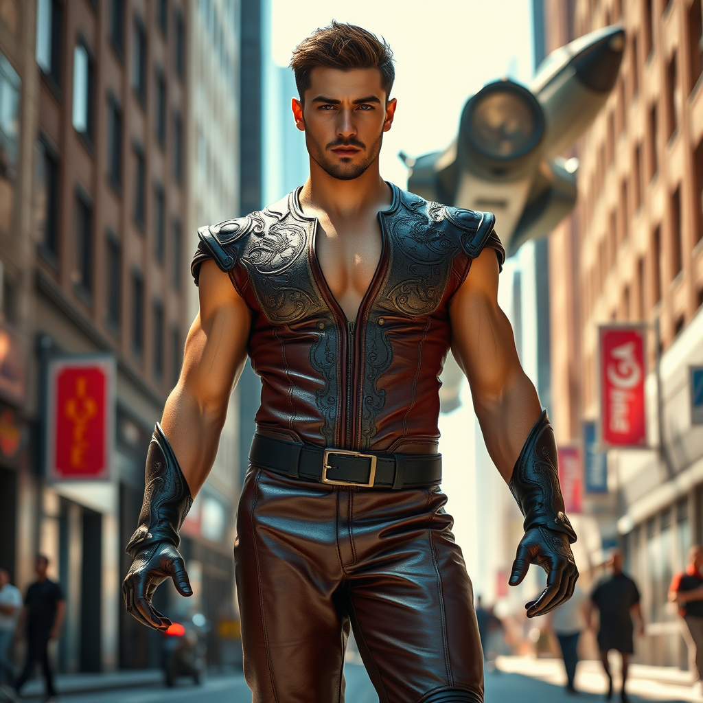 28-year-old Israeli Caucasian male, hero pose, standing tall with an air of confidence akin to a modern-day warrior. The scene is set in the bustling streets of NYC under the bright afternoon sun. He exudes power and strength, with a finely sculpted body, a chiseled jawline, and a full chest subtly visible beneath a richly detailed leather uniform adorned with intricate designs that catch the light. His piercing eyes and shiny hair enhance his commanding presence. The outfit, completed by tall leather boots, speaks of both style and functionality. The futuristic backdrop shows a sci-fi ship in mid-launch, adding a layer of surreal drama. Photographed in 8K ultra-HD with a Hasselblad X1D-50c camera, capturing the essence of cinematic and moody lighting, the image emphasizes photorealism and vibrant detail, creating an epic and immersive scene. The portrait maintains a focus on natural textures, light effects, and an action-ready stance, delivering a highly detailed, movie-style moment of triumph and sheer presence.