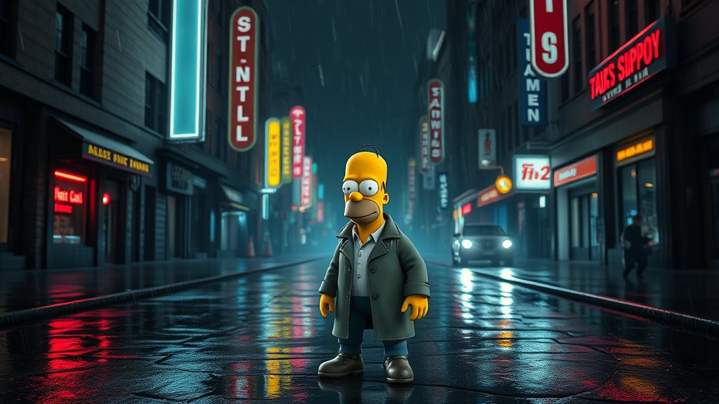 3d cartoon Homer Simpson standing alone in a shadowy, rain-soaked dystopian cityscape, illuminated by the glow of neon signs reflecting off wet pavement. The scene is cinematic and moody, reminiscent of a Blade Runner atmosphere, with detailed ultra 4k hyper-realistic textures. Adjust the setting to feature cracked sidewalks and flickering street lamps adding to the eerie ambiance, while Homer dons a futuristic trench coat, emphasizing the blend of cartoon and cyberpunk elements.