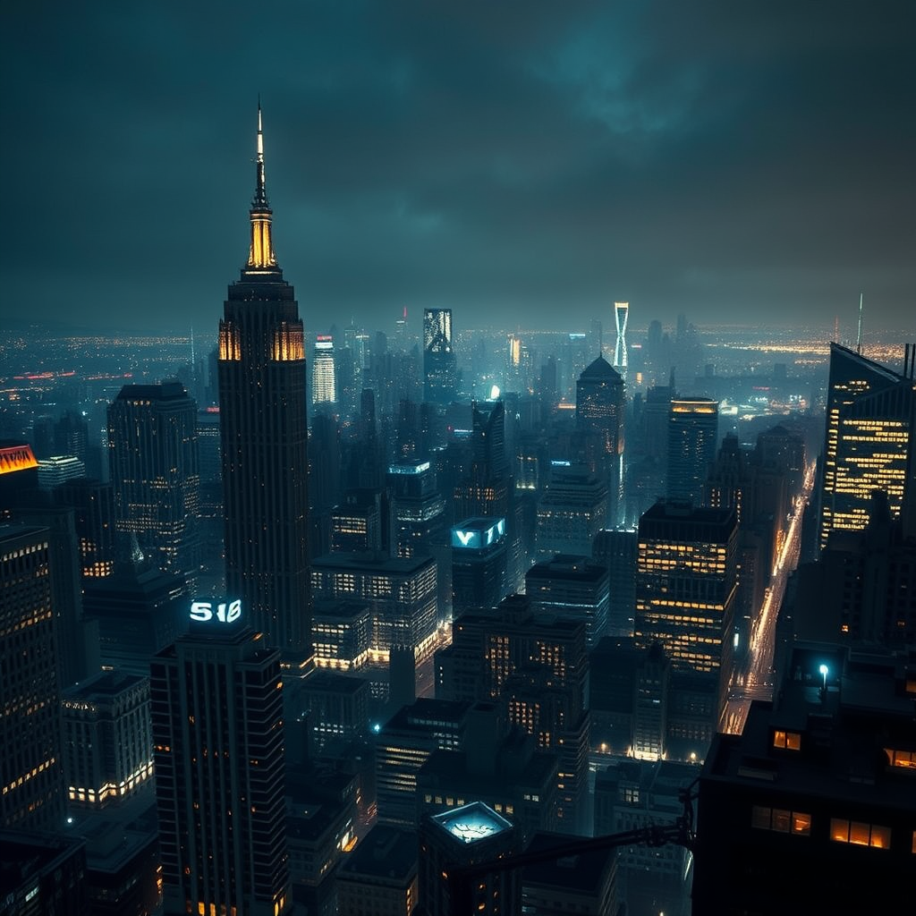 Gotham City skyline view, cinematic panorama, ultra-high resolution, night ambiance, dramatic lighting, subtle accent illumination, luminescent glow, meticulous post-production, astonishing detail and complexity, hypermaximalist design, sophisticated, embellished, hyper-realistic, intricately detailed urban landscape, aspect ratio 9:16.
