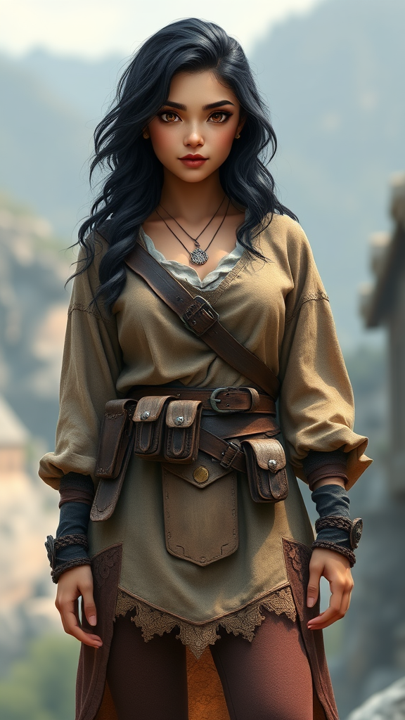 A fantasy RPG portrait of a young female adventurer, featuring wavy black hair and a warm dark tan complexion. She has large, pretty brown eyes that convey friendliness and intelligence. Clad in a long, loose fantasy tunic paired with cloth tights, she exudes confidence. Her ensemble includes a thick leather belt adorned with many pouches and leather armor, emphasizing her adventurous spirit and practicality. Her wide hips give her a distinctive silhouette. The style emphasizes UHD, HDR, and 8K quality, reflecting the rich and immersive details typical of the fantasy genre. The background subtly suggests a magical world without overt elements, maintaining an air of mystery and exploration. The overall image is clear, crisp, and free of distortions or distractions.