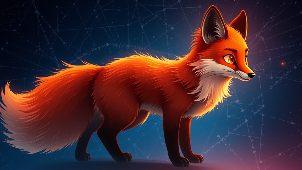 A vivid image of a deeply orange, animated fox with fiery red hues, its fur appearing silky and detailed, glowing with an inner luminescence. Its eyes sparkle with intelligence and curiosity, reflecting an endless stream of information akin to the open web. The fox's tail curves around it like a protective shield, reminiscent of the globe's curvature, with hints of deep blue representing digital exploration and freedom. It stands poised against a cosmic backdrop, where constellations form patterns of circuitry, exuding a sense of agility and swiftness, embodying the spirit of exploration and innovation.