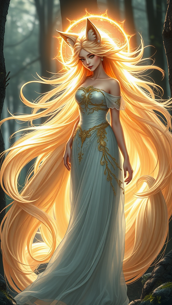 A mesmerizing hyper-realistic image depicts the ultimate nine-tailed fox girl, a figure of otherworldly allure and strength. This artwork embraces hyper maximalism, with every detail intricately crafted to captivate the viewer's imagination. She stands gracefully in a mystical forest, radiating an aura of ethereal elegance. Her flowing hair cascades like liquid gold, shimmering with an inner light that alludes to her celestial heritage. Each strand is meticulously rendered, capturing the dynamic play of light as it moves across her silky tresses, enhancing her divine presence.