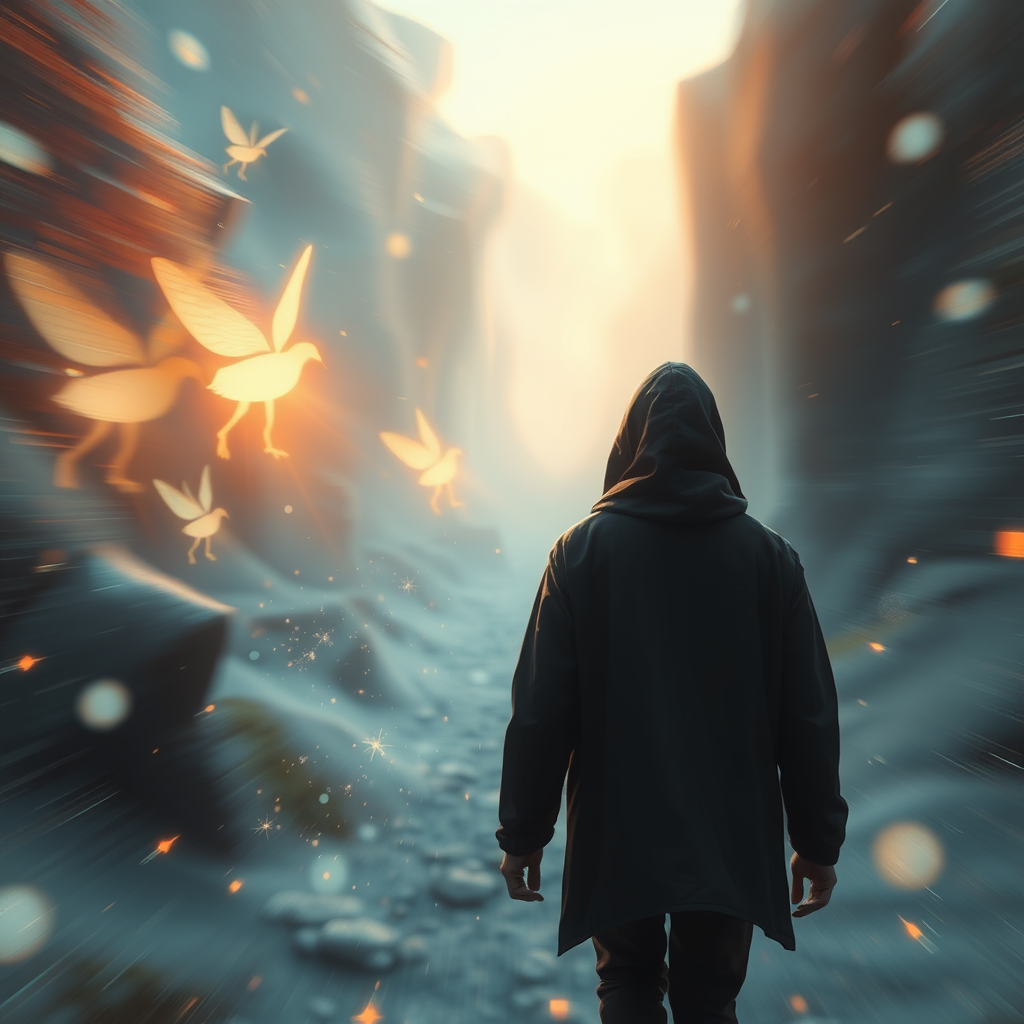 A lone figure strolling through an ethereal scene, surrounded by a surreal landscape where shimmering particles and motion blur create a dynamic effect. The figure's eyes are hyperrealistic and strikingly detailed, capturing the viewer's attention with sharp focus in an HDR, 8k resolution setting. This vivid image, reminiscent of Stanley Artgerm Lau's style, is framed with light particles and mysterious pixies flitting in the background. The space is filled with a magical ambiance, with objects hovering serenely in the air. Despite the fantastical elements, the depiction avoids anatomical distortions or disfigurements, ensuring a coherent and aesthetically pleasing composition. The artwork is professionally crafted, avoiding beginner errors and maintaining a high standard of quality without unnecessary embellishments or distractions.