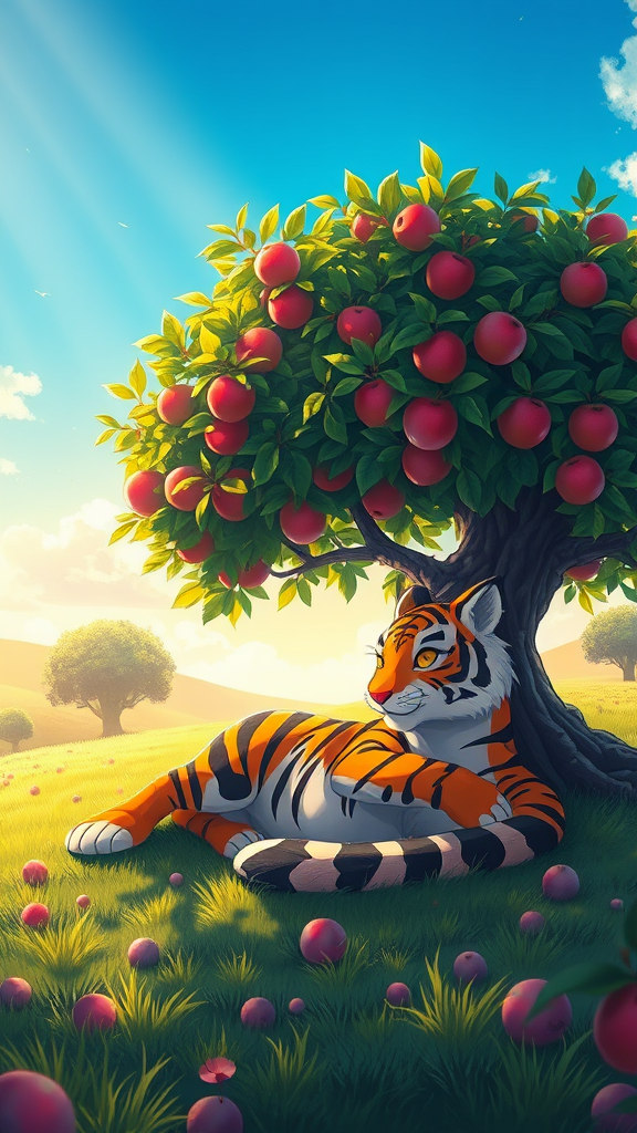 A vibrant digital art of a majestic tiger-like Pokémon lounging gracefully under a lush apple tree, depicted in a whimsical cartoon style with elements of magic realism. The scene is brought to life with bright, bold colors, showcasing hyper-quality and high-detail in a towering composition that captivates the viewer with its enchanting glow and surreal atmosphere. The Pokémon's striped fur and expressive eyes glisten under the dappled sunlight filtering through the tree's abundant foliage, casting playful shadows on the verdant ground below. In the backdrop, the sky transitions from a clear azure to a soft, golden hue, enhancing the mystical and serene ambiance of this imaginative landscape.