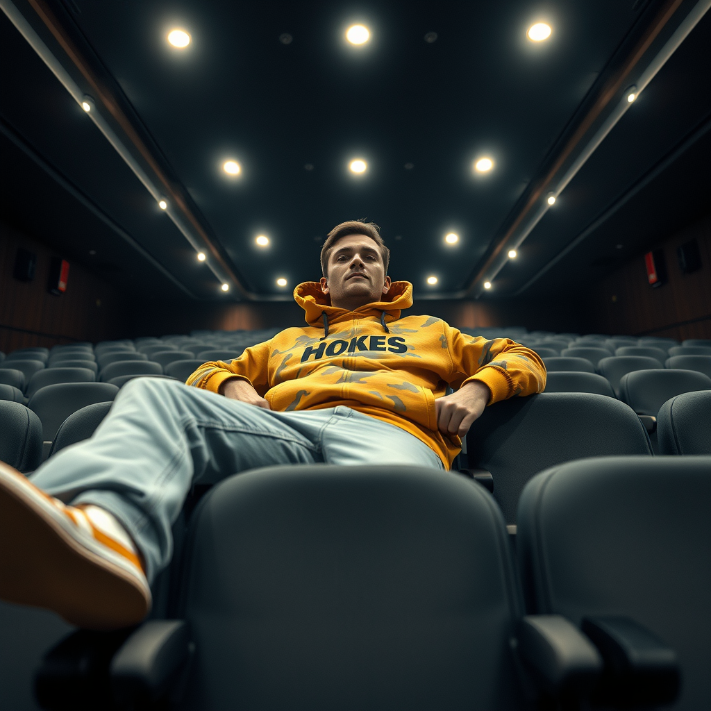 A professional male model is lounging across the seats in a dimly lit movie theater, captured in a front view, long-distance shot. He is wearing an oversized yellow camouflage hoodie paired with light-washed jeans, embodying a sense of carefree relaxation. The theater serves as the backdrop, showcasing a full architectural view. The soft glow of ceiling lights casts a gentle ambiance, enhancing the photorealistic quality of the scene with high contrast and highlights. The vast expanse of the theater, with its intricate details, is captured in UHD, emphasizing the serene and idle mood while adding a touch of unexpected intrigue with the choice of casual, bold attire.
