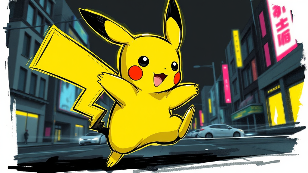 Pikachu in a dynamic pose, showcasing anime-inspired sketch style with nvinkpunk influences, featuring abstract brush strokes and bold, heavy lines. The scene follows an HDR Neo-Noir aesthetic with bright yellow neon highlights and minimalistic elements, adding a unique twist to the traditional depiction.