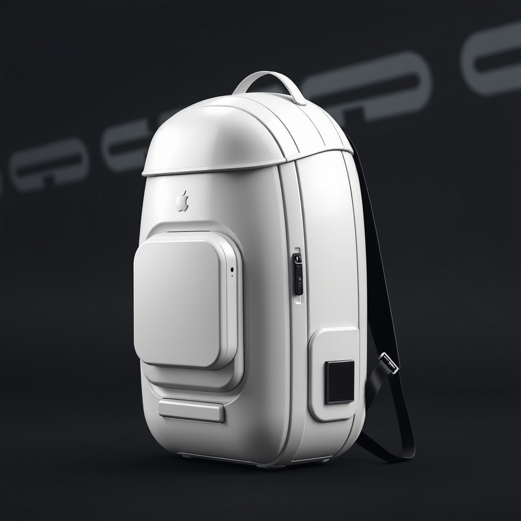 Sleek capsule-shaped white backpack featuring a hardcase exterior, inspired by urban stormtrooper aesthetics, showcasing a minimalist and clean design. Rendered in high detail with intricate textures using Octane 4K, the backpack evokes the timeless design principles of Dieter Rams and Apple's iconic product designs. Subtle futuristic elements and ergonomic touches complete the modern urban look.