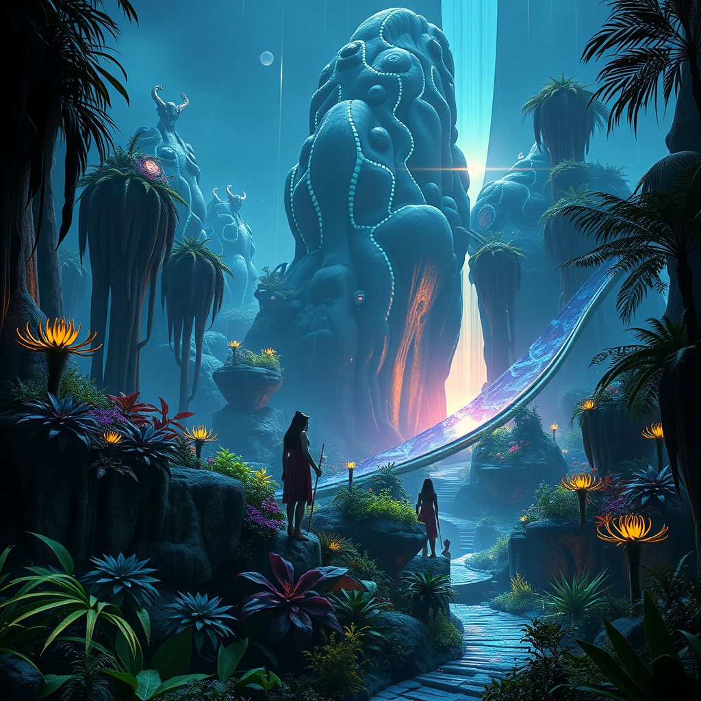 Na'vi beings, science fiction realm, lush Pandora ecosystem, cinematic vision by James Cameron, vertical composition, enhanced alien flora and fauna, mystical atmosphere, bioluminescent landscapes, vibrant colors, ethereal ambiance, harmonious blend of nature and technology.