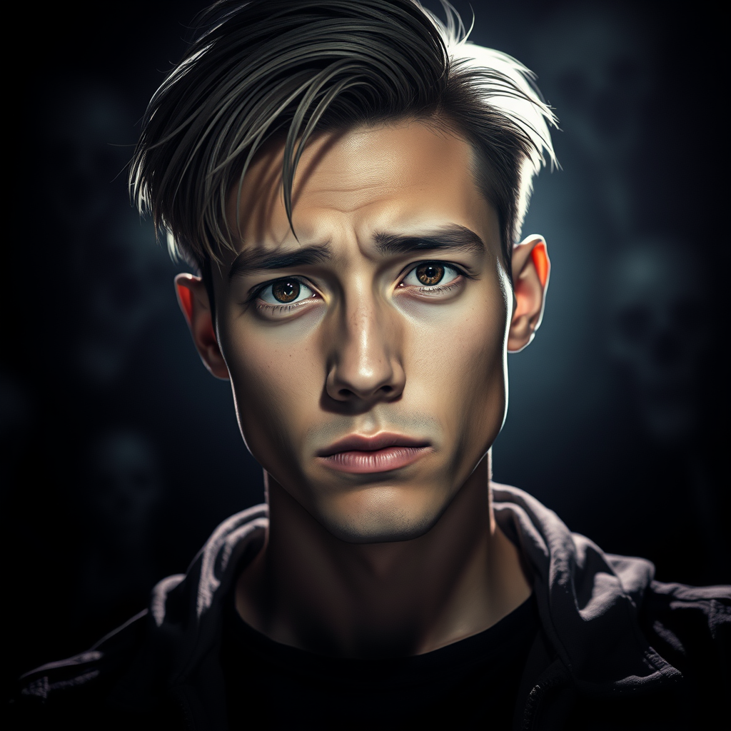 A captivating three-quarter close-up portrait of a 30-year-old man with a slender athletic build and a strikingly handsome face. He wears a frown paired with an innocent expression, as his hair frames his features. The scene is set against an oppressive and dramatic background, featuring contrasting elements with a touch of gloom and horror. The atmosphere is crushing, yet intensely expressive, with backlighting creating a cinematic effect. The shot appears to be taken from a low angle using a DSLR, with precise photographic settings: aperture f/7, shutter speed at 1/100 sec, and ISO 150. This hyper-realistic portrait captures every detail and texture, enhanced by cinematic lighting akin to an anime style. Only the man is in focus, as blindingly bright light creates a dynamic tension with the dark, moody background.