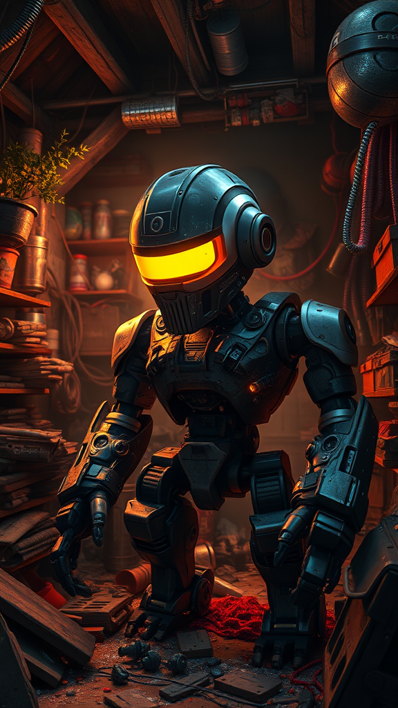 Masterpiece, top-tier quality, ultra high-resolution, wide-angle environmental shot in a cluttered and chaotic shack, dynamic scene, league of legends inspiration, vibrant, photorealistic, lifelike, dramatic atmosphere, dark tones, sharp focus, 8k. Robot in ruins with a glowing yellow visor depicted as a realistic sci-fi cyberpunk gangster, medium shot, intricate design, created with Unreal Engine, cozy indoor lighting, featured on artstation, detailed craftsmanship, inspired by James Gurney and Katsuhiro Otomo, cinematic lighting, lush and vibrant natural elements, by Craig Mullins and Greg Rutkowski, volumetric lighting effects, trending on artstation, rendered in octane, crystal-clear focus, studio photography style, intricately detailed, highly sophisticated, Cyber 2077 theme.