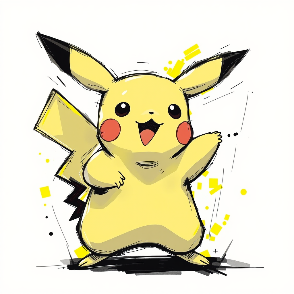 Pikachu dynamic stance anime style sketch, nvinkpunk influence, abstract brushwork, bold heavy lines, HDR Neo-Noir aesthetic, vivid neon yellow highlights, subtle creative twists, minimalistic elements.