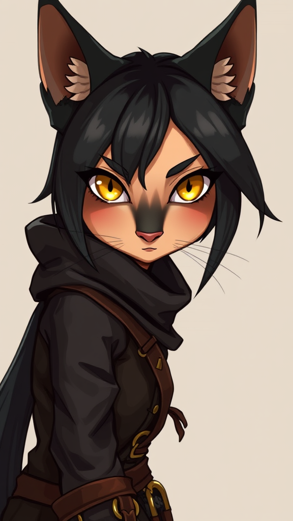 1girl, tabaxi, khajiit, sleek black fur, anthro features, cat-like nose, pointed animal ears, feline-inspired girl, mid-shot framing, warm yellow hues, piercing amber eyes, uncomplicated backdrop, rugged leather attire, stealthy rogue, nimble thief, subtle hints of gold and ivory, cunning expression, agile stance.