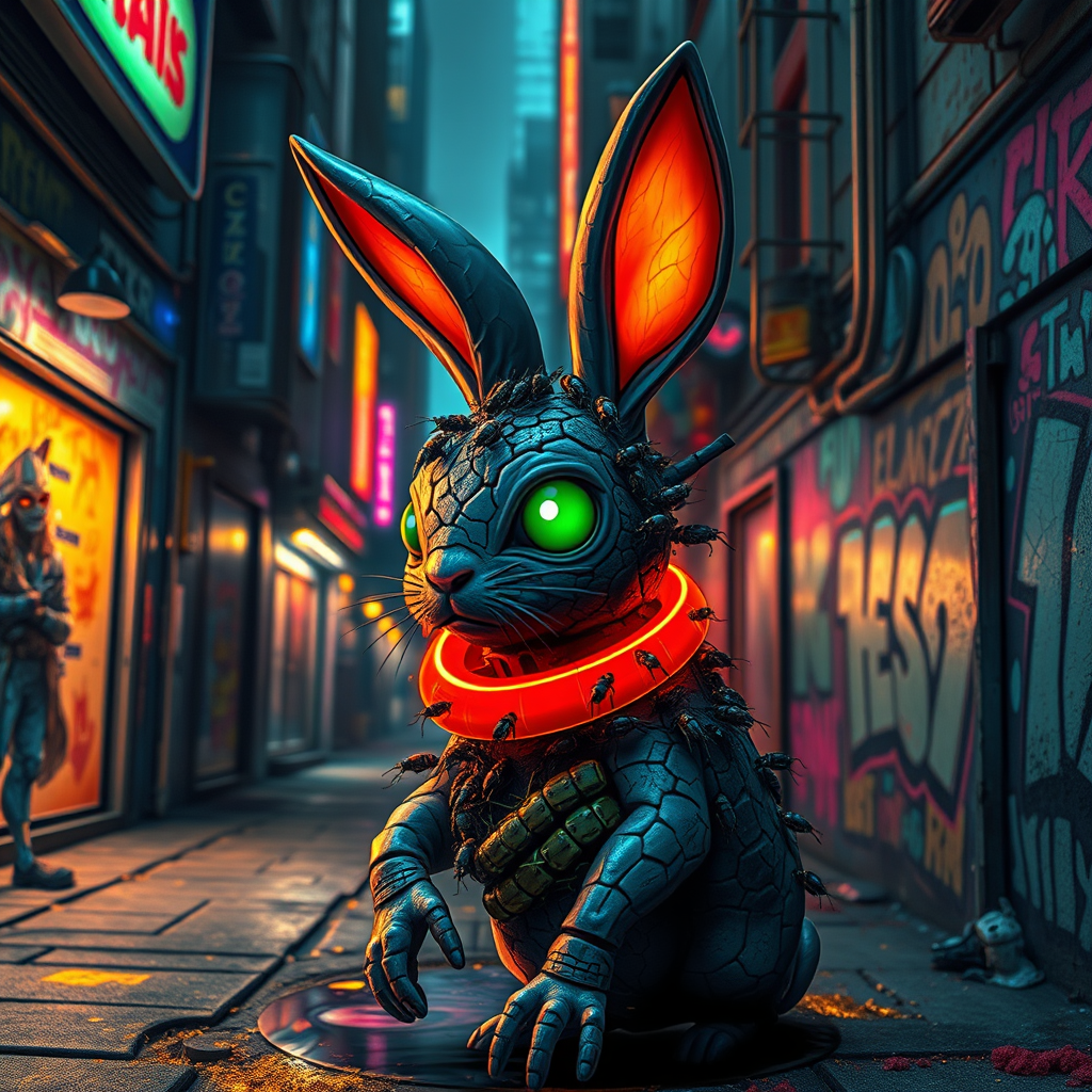 A zombified rabbit adorned with a neon-tinted collar emerges from the futuristic landscape of a cyberpunk metropolis. Its appearance is simultaneously whimsical and sinister, a unique blend of vibrant and shadowy elements. The bunny's form is an intricate mosaic of swarming insects, constantly shifting and reassembling, creating an ever-evolving silhouette. Its attire is a riot of colors, echoing the graffiti-splashed walls of the city, where bright shades dance under the glow of flickering streetlights. This creature stands out against the backdrop of a world that is both lit and honeycore, where glimmering honey-like substances ooze through the cracks of dark alleyways. The playful, yet foreboding character of this creation exudes a raw style, teetering on the edge between enchanting and eerie.