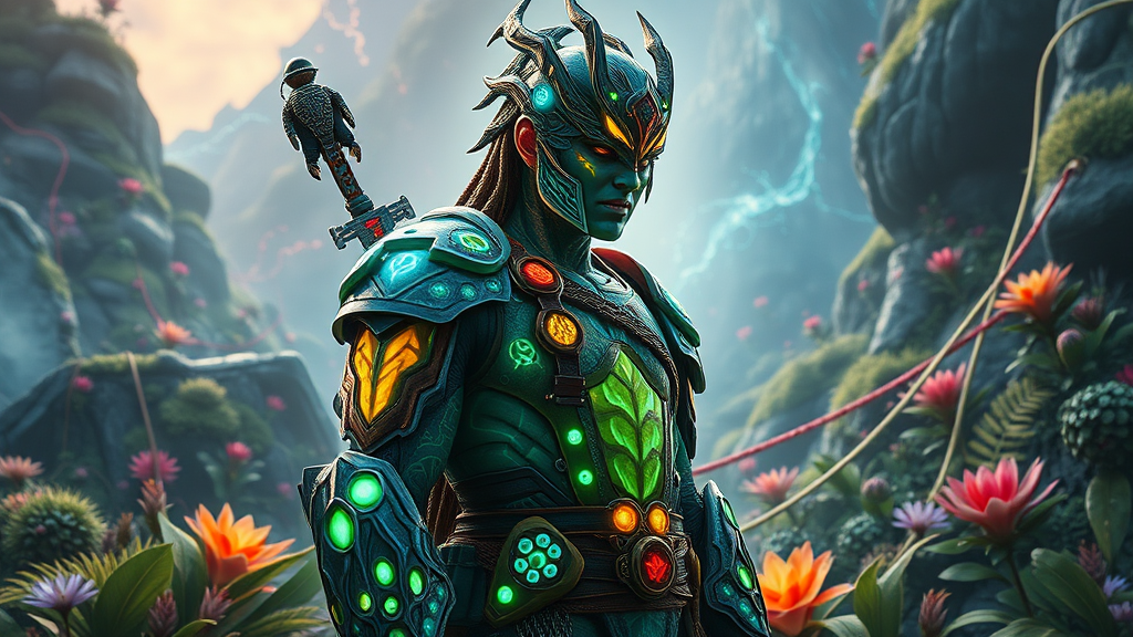 Legends never die, 5D dimensional, full body portrait, crafted with the power of unreal engine 5, meticulously detailed, 3d octane render, echoing the vibrant and imaginative style of Biomutant, breathtaking digital concept art inspired by the visionary Stanley Artgerm, featuring a mythical warrior with bioluminescent tattoos, adorned in futuristic armor infused with nature elements, amidst a dynamic landscape where colorful flora and shimmering energy currents merge, creating a harmonious balance between technology and wilderness.