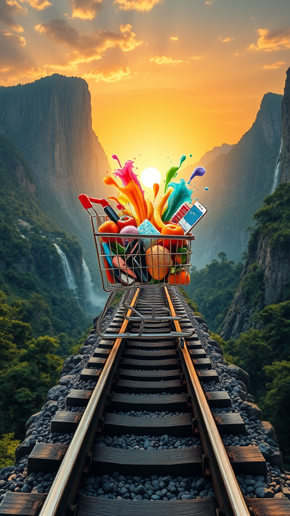 A hyper-realistic, surreal image depicts a dramatic railway track slicing through a picturesque mountainous landscape, abundant with lush greenery and cascading waterfalls. At the track's center, a shopping cart teeters precariously, overflowing with a vibrant array of colorful objects, symbolizing e-commerce excess. The cart bursts with fresh fruits, vegetables, electronic gadgets, household items, and vivid, paint-like textures that swirl into the sky, creating a dynamic explosion of color. The scene suggests a cornucopia of commercial abundance, its kaleidoscopic contents floating weightlessly, adding depth and a sense of defiance against gravity. The setting sun drenches the landscape in a warm, golden light, casting elongated shadows and enhancing the dramatic mood. Textures and materials are meticulously detailed, with light and shadow reflecting convincingly. The work conveys a vibrant and kinetic energy, blending fantastical elements and commercial opulence, and falls under the realm of Surrealism or Modern Fantasies, captivating with its dynamic, colorful essence and omitting any static or dull components.